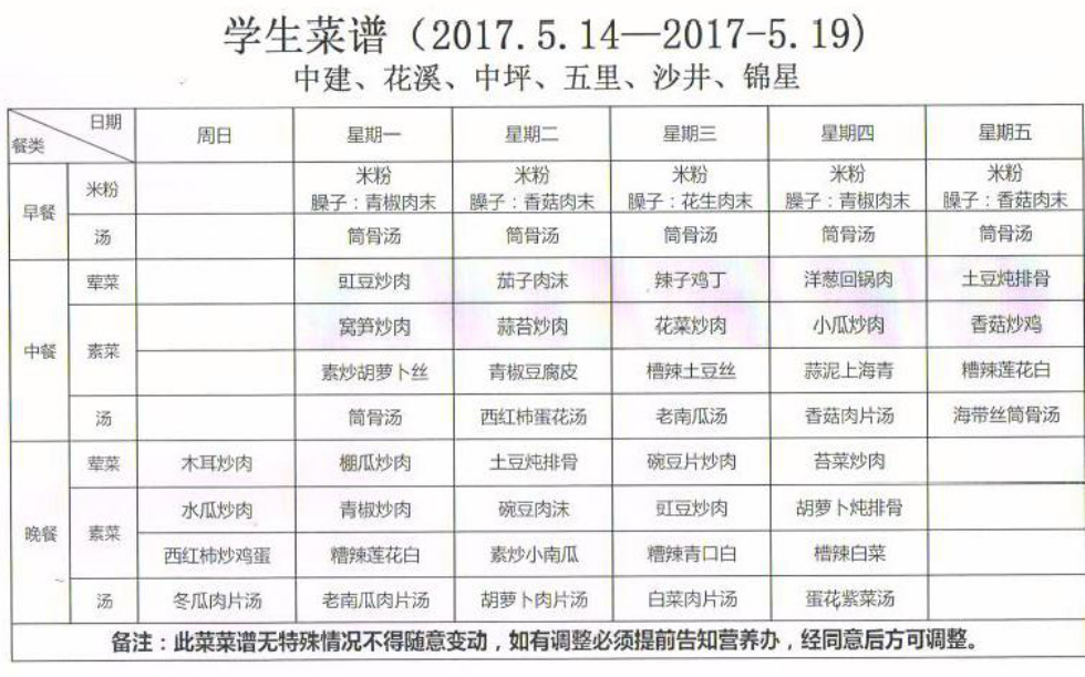 公司提前一周制作好食谱,由相关领导部门审核批准后,按照营养餐食谱的要求统一搭配所需食材,根据由有关部门提供的就餐学生人数,计算出整个学校需要配送食材的重量,统一进行采购。统配,统送,即所需食材由公司统一按时按质按量送达学校食堂。再由公司统聘学校学生生活服务人员与学校有关领导共同验收食材,签字。